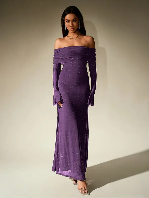 Step into the spotlight with the ANDREA™ Women's Off-The-Shoulder Ruched Contrast Sequin Bodycon Dress, a stunning piece that seamlessly blends elegance and allure. Perfect for evening soirées or special occasions, this dress accentuates your silhouette while making a bold fashion statement.